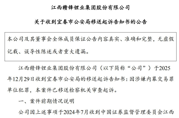 12月29日晚,赣锋锂业公告称,公司于2025年12月29日收到宜春市公安局的移送起诉告知书,因涉嫌内幕交易罪单位犯罪,案件已移送检察机关审查起诉。