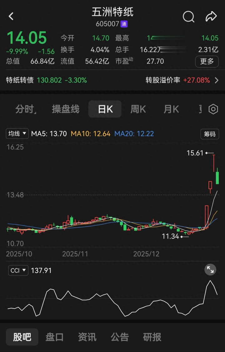 12月27日五洲特纸(605007)高开低走封死跌停,终结三连板。表面看是短线资金获利兑现,实质是汇率加速升值后的第一次良性换手: